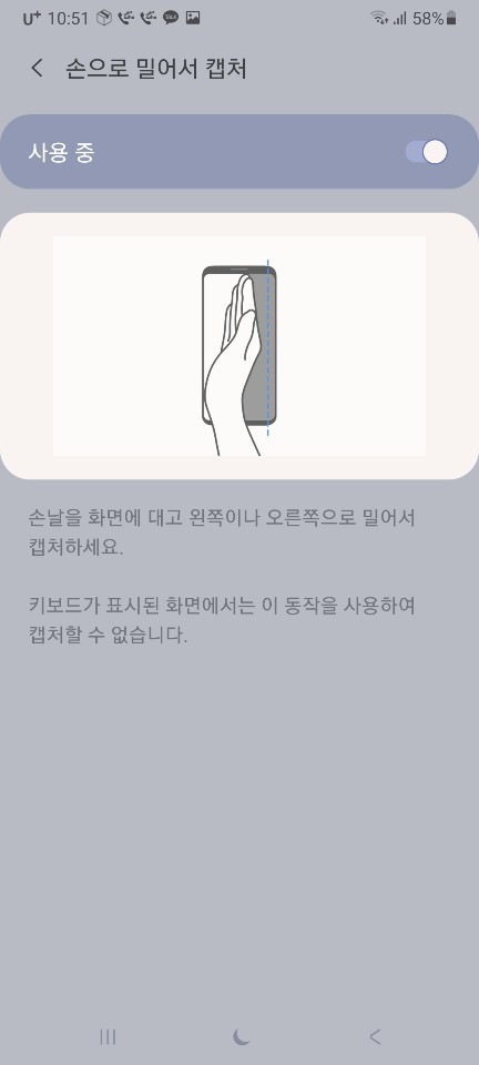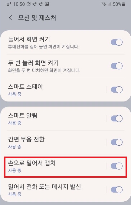 '모션 및 제스처'를 눌러 들어가보면 메뉴 중 '손으로 밀어서 캡처'라는 것이 있다.