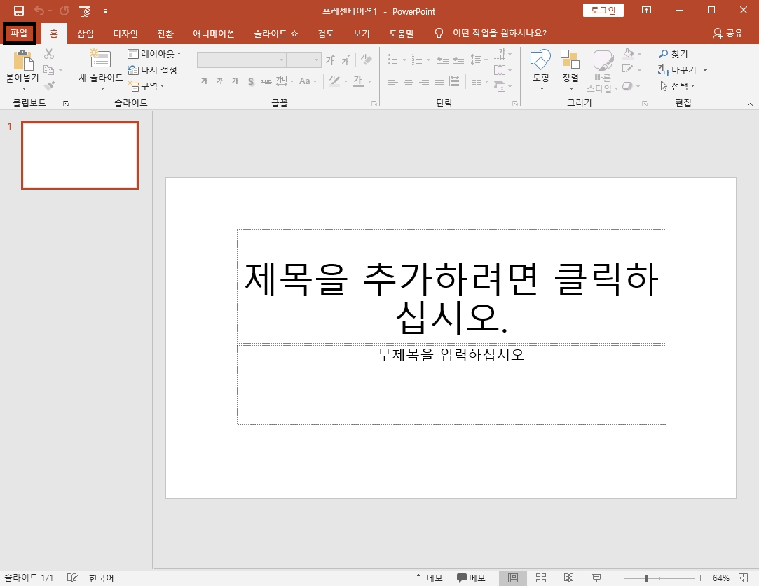 파워포인트 화면에서 상단메뉴 중 '파일'을 누른다.