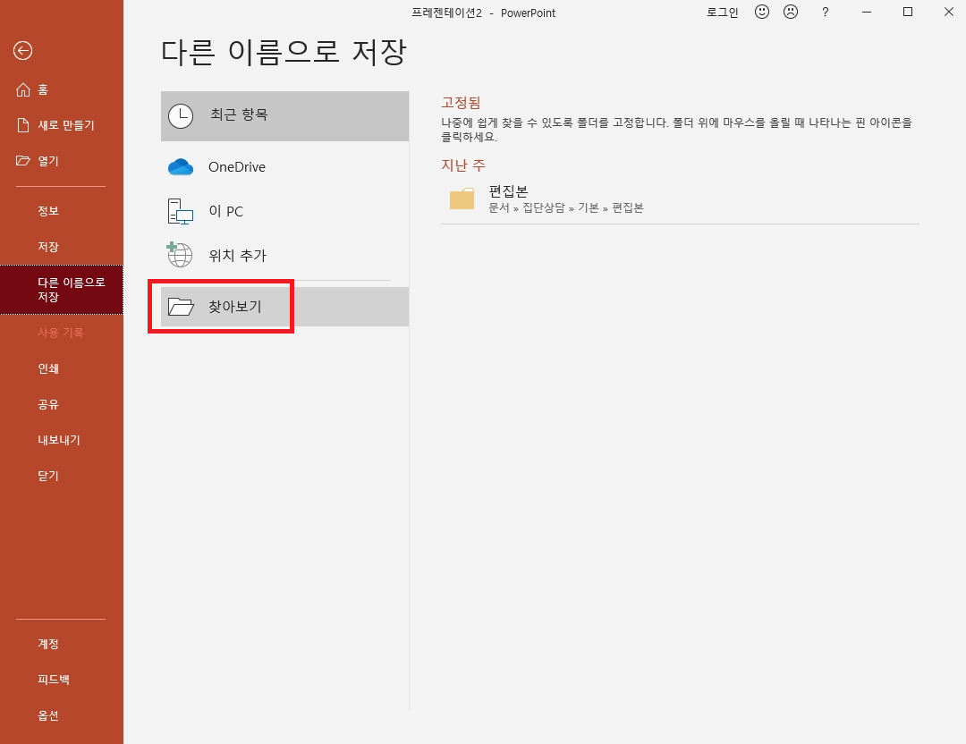 그다음, '저장'이나 '다른 이름으로 저장' > '찾아보기' 를 누른다.