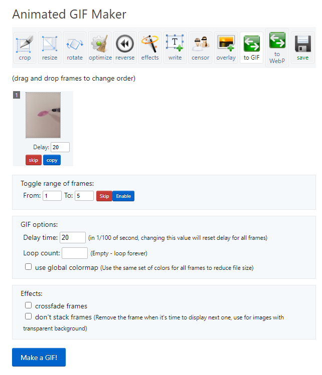 Easy to use online animated GIF maker and image editor. Upload and edit GIF images for free. Create, crop, resize, reverse, optimize and split animated GIFs, cut and resize videos, WebP and APNG animations.