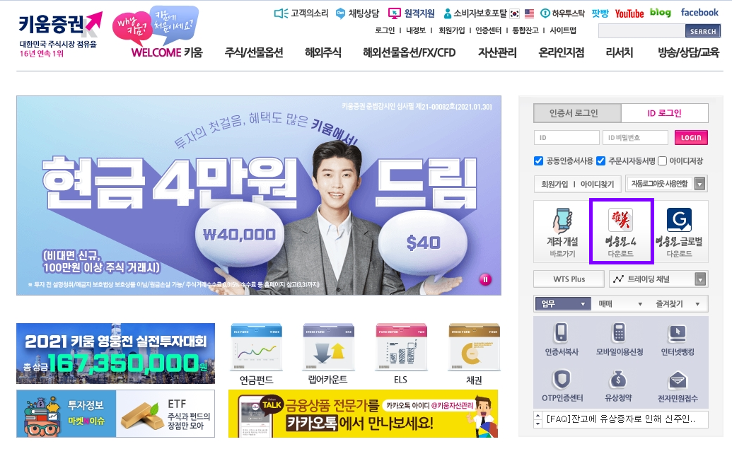 개인이 주식을 거래할 수 있는 여러가지 HTS가 있는데, 이 글에서는 키움증권의 HTS인 영웅문4를 다운로드 하고 로그인해서 초기화면 실행하는 방법까지 알려드리려고 한다.