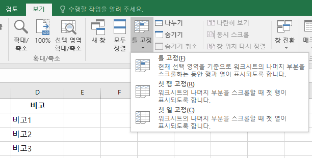 틀 고정, 첫 행 고정, 첫 열 고정 세 가지가 있다.
