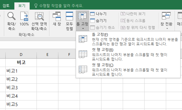 그리고나서 메뉴 중 보기로 가서 제일 처음에 있는 "틀 고정"을 클릭한다.