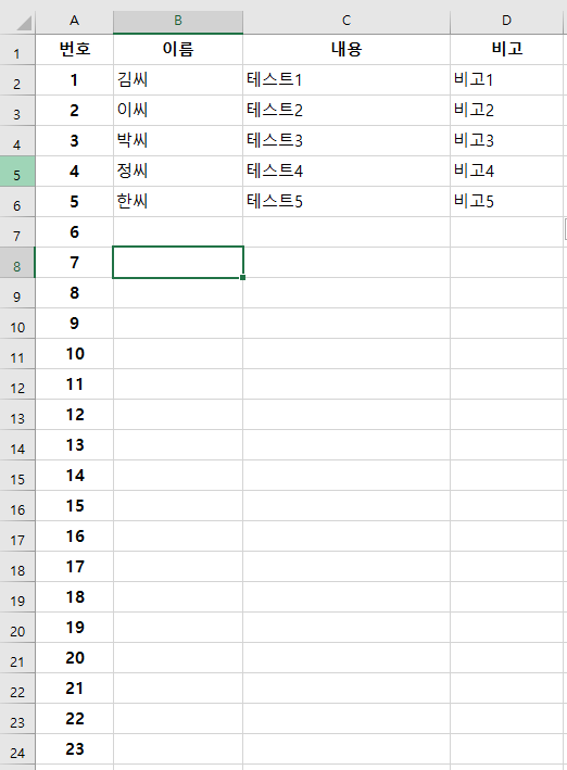 옆으로 셀을 이동해도 B열이 틀 고정된 것을 볼 수 있다.