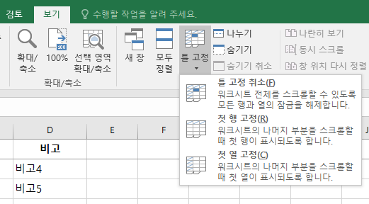다시 보기의 틀 고정으로 가보면 "틀 고정"이 "틀 고정 취소"로 바뀌어 있을 것이다.