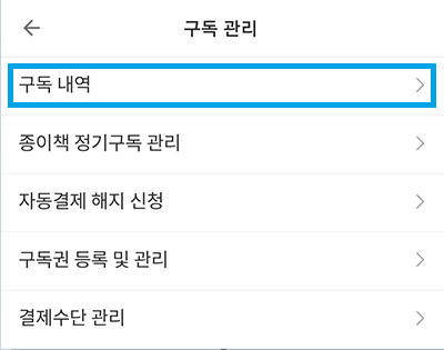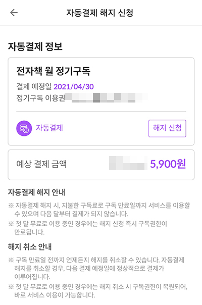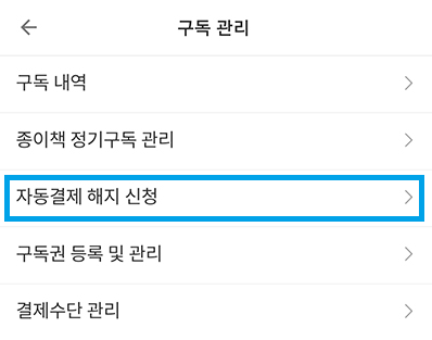 3. 구독관리 메뉴 중 '자동결제 해지 신청' 을 클릭한다.
