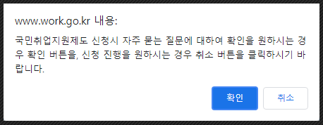 아래와 같은 팝업창이 뜬 사람은 '확인'을 클릭하여 워크넷으로 가서 구직신청을 먼저 하고 다시 오자.