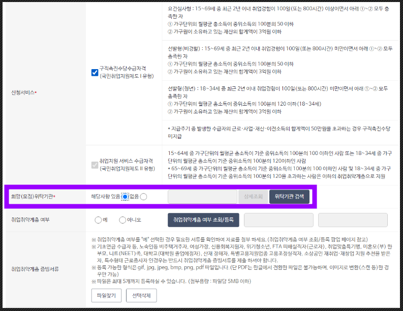6. '취업지원유형ㆍ가구원정보 등록' 페이지를 작성하면 되는데, 여기에서 희망하는 위탁기관이 있다면 '희망(모집)위탁기관' 부분에서 '해당사항 있음'을 선택하고 위탁기관 검색으로 검색해서 선택하면 고용센터에서 내가 지정한 기관으로 배정해준다.