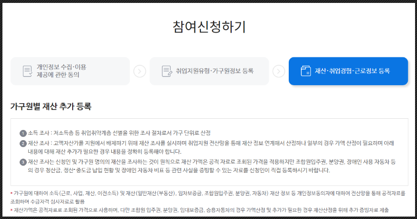 7. 마지막 단계인 '재산ㆍ취업경험ㆍ근로정보 등록' 탭을 작성하고,
