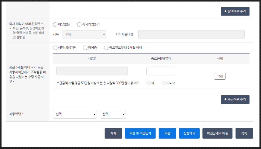 7. 마지막 단계인 '재산ㆍ취업경험ㆍ근로정보 등록' 탭을 작성하고,