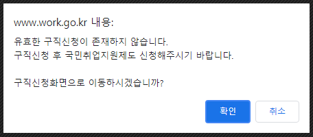 아래와 같은 팝업창이 뜬 사람은 '확인'을 클릭하여 워크넷으로 가서 구직신청을 먼저 하고 다시 오자.