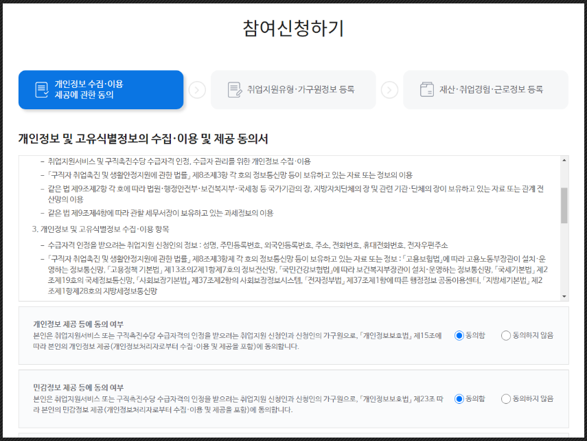 '개인정보 수집ㆍ이용 제공에 관한 동의' 페이지 작성 후, 하단의 '다음단계'를 클릭한다.