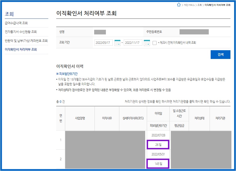3. 아래와 같이 조회기간 내에 제출된 이직확인서 내역이 뜬다.