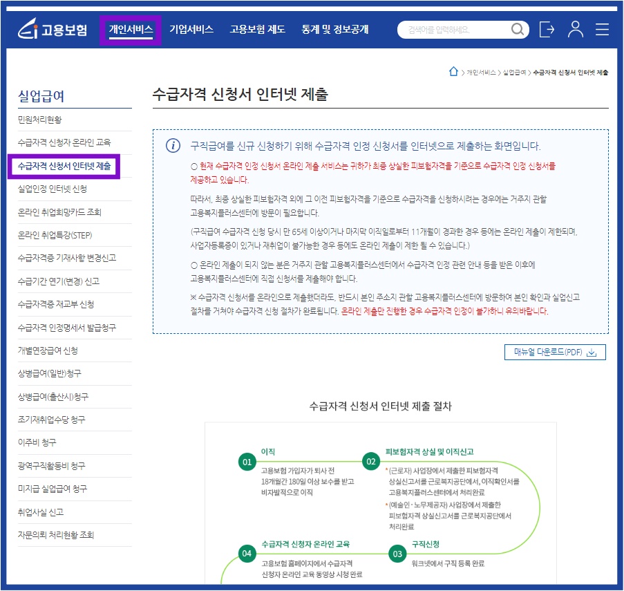 그러면, '개인서비스>수급자격 신청서 인터넷 제출' 메뉴에 들어갔을 때 작성가능한 상태가 된다.