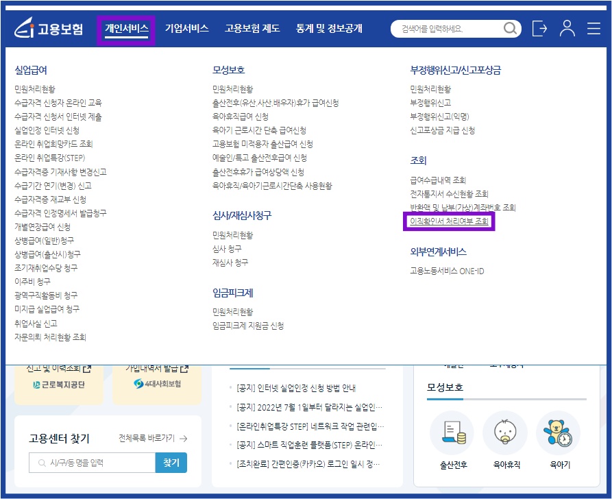 2. 로그인 후 상단메뉴에서 '개인서비스>이직확인서 처리여부 조회' 를 클릭한다.